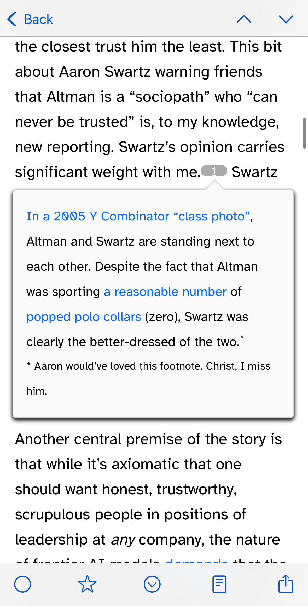 When I click on a Daring Fireball footnote in Netnewswire it brings up an inline popover with the footnote in it without loading the web page. When I do the same for a JD footnote it kicks me out to a full version of the web page and jumps to the bottom to se the footnote.