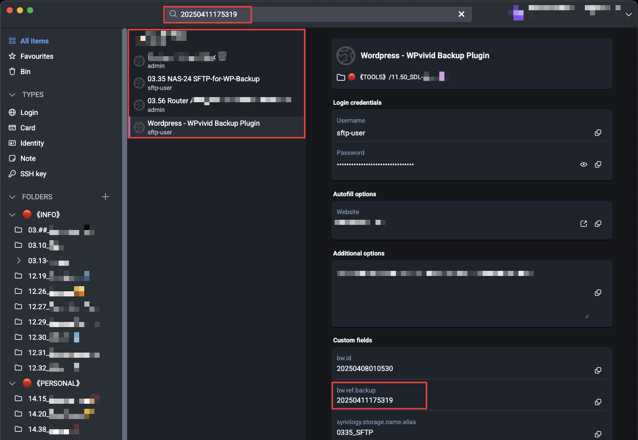 I use references, e.g., 20250411175319, inside Bitwarden since it doesn’t support linking entries directly. For example, I connected all entries related to 03.35 NAS-24 SFTP-for-WP-Backup (the referenced entry), which is the account dedicated to a specific backup task on the Synology device. These entries are spread across different JD folders.
