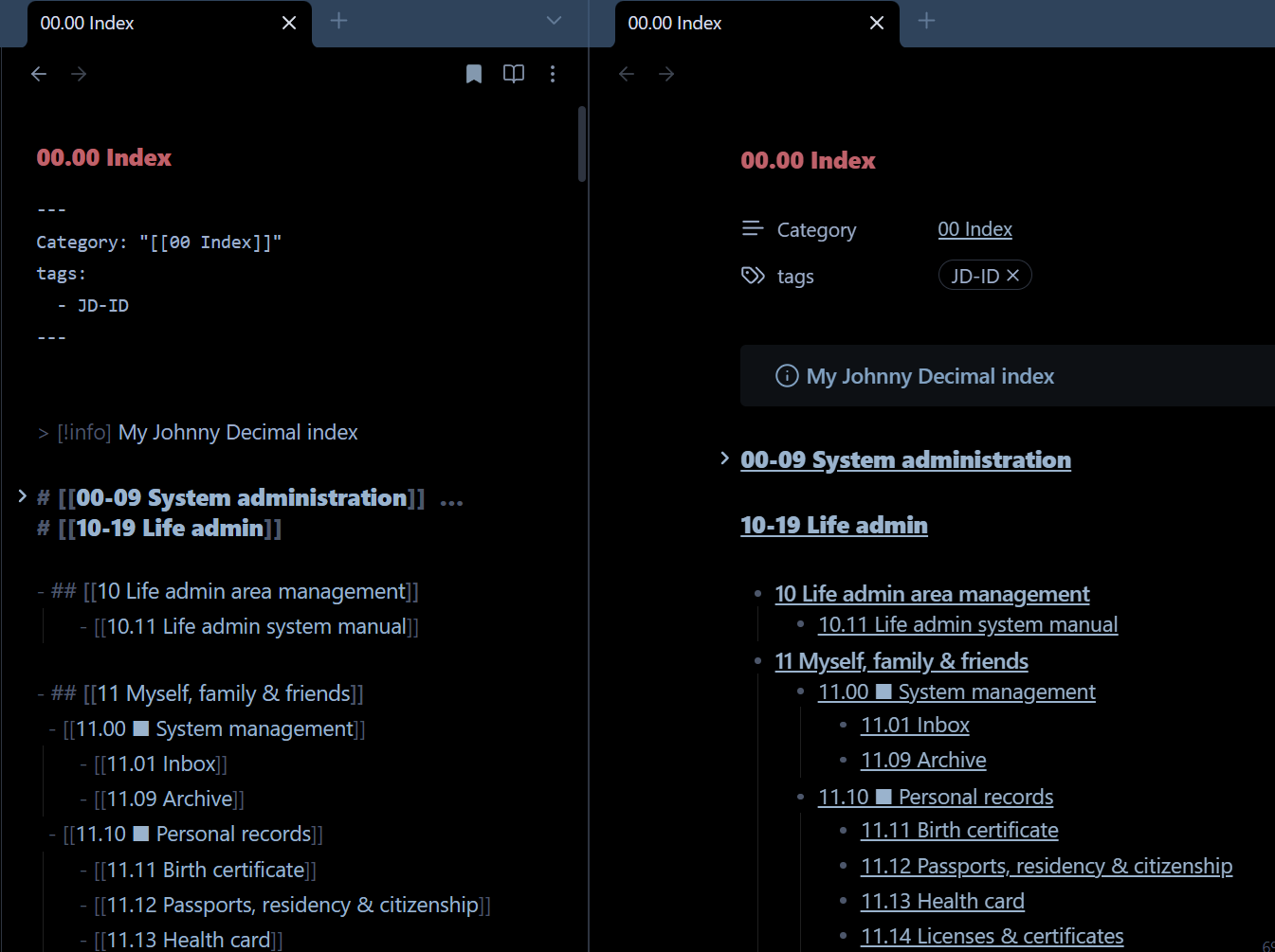@m.rose, I’m not sure if you’re asking me or one of the others who posted in this thread? I did not use Bases for my JDex, because I wanted it to be pure markdown in case I ever want or need to migrate it from Obsidian in the future. Here’s what it looks like in Editing and Reading view side-by-side: