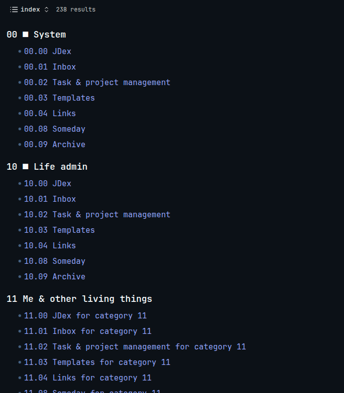 If you don’t mind, would love to hear about how you’ve used Obsidian to create your JDex if you don’t mind. I figured with Bases that it should automatically create a JDex (why I finally dove into the JD system) but because Bases ignores folders, it doesn’t exactly work in the sense that it displays in order but folders aren’t clickable (probably not the worst but looking at other systems).