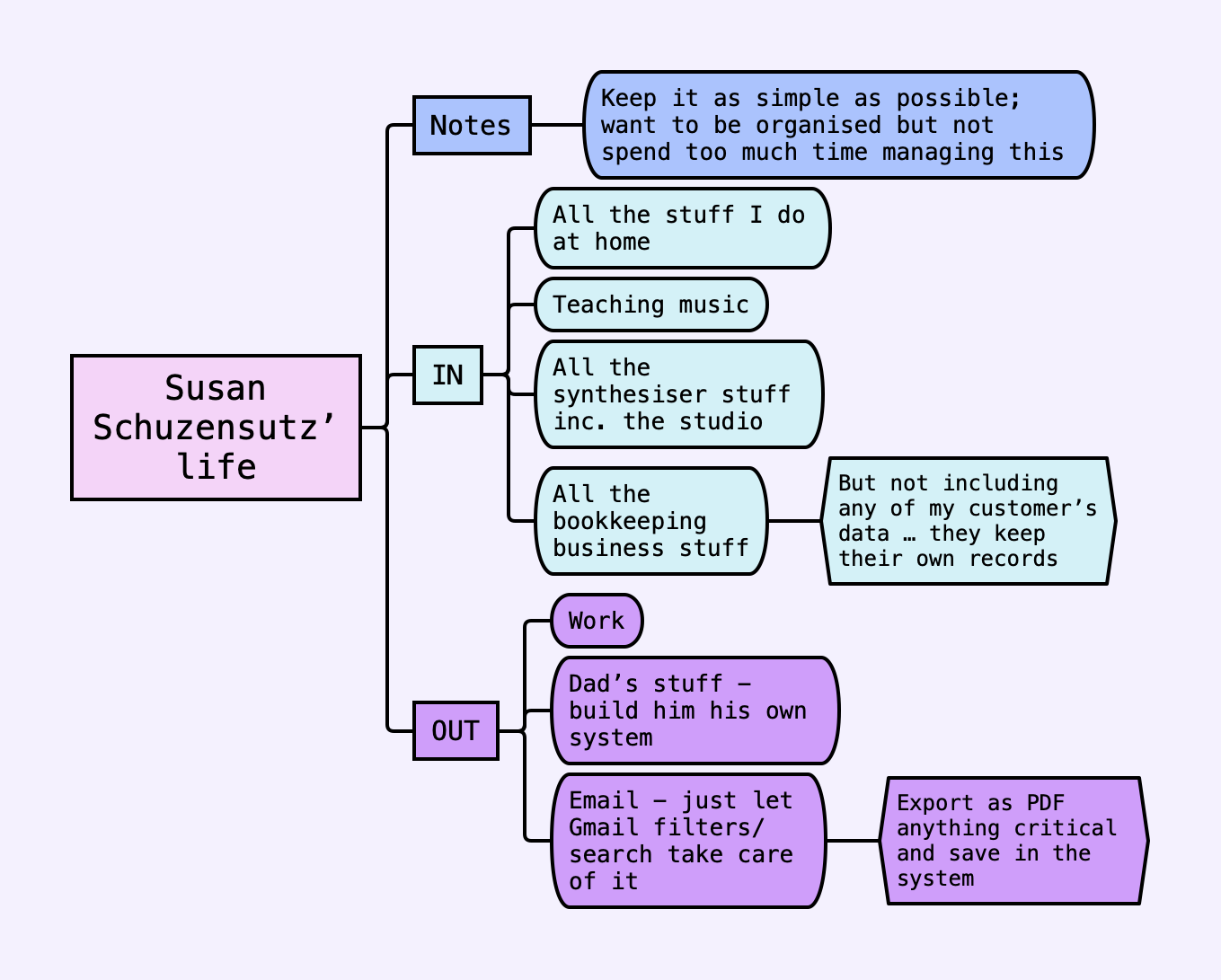 @death.au I just noticed that you specifically called out that you want your partner to be able to understand your system, a great point. Later on when we’re designing the structure, Johnny says to “aim for a system that a stranger could use”. Your partner may not be a stranger, but I found this helpful when I had to make harder decisions about where stuff should go. Where would anyone else logically look?