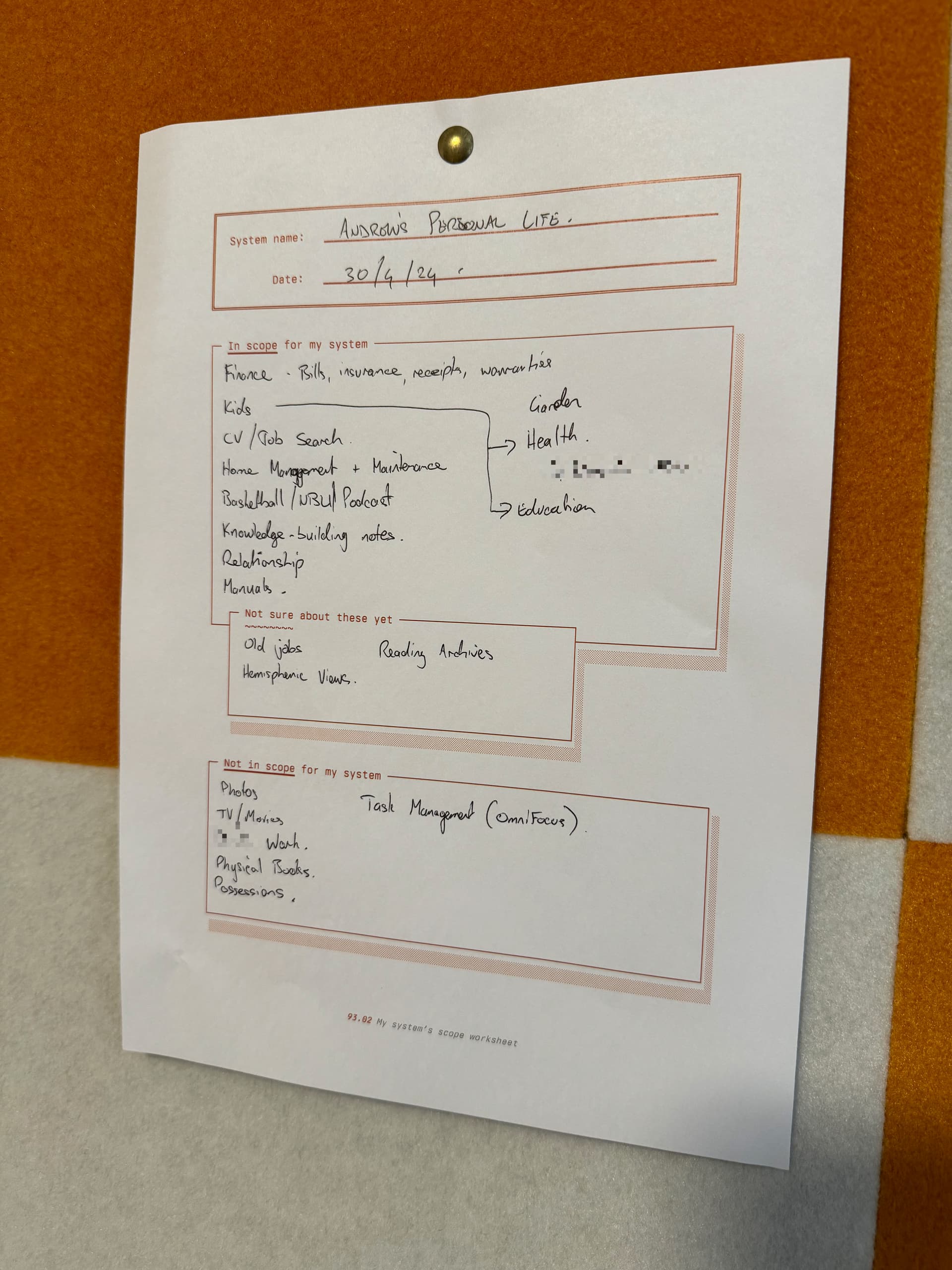 I found it handy when Johnny said that I should just acknowledge the existence of some things that I first thought I’d keep out of scope (like photos and files on old hard drives), but that I didn’t have to organise them. So they became in scope, but without any additional workload. I’ll just be able point to them in my index eventually.