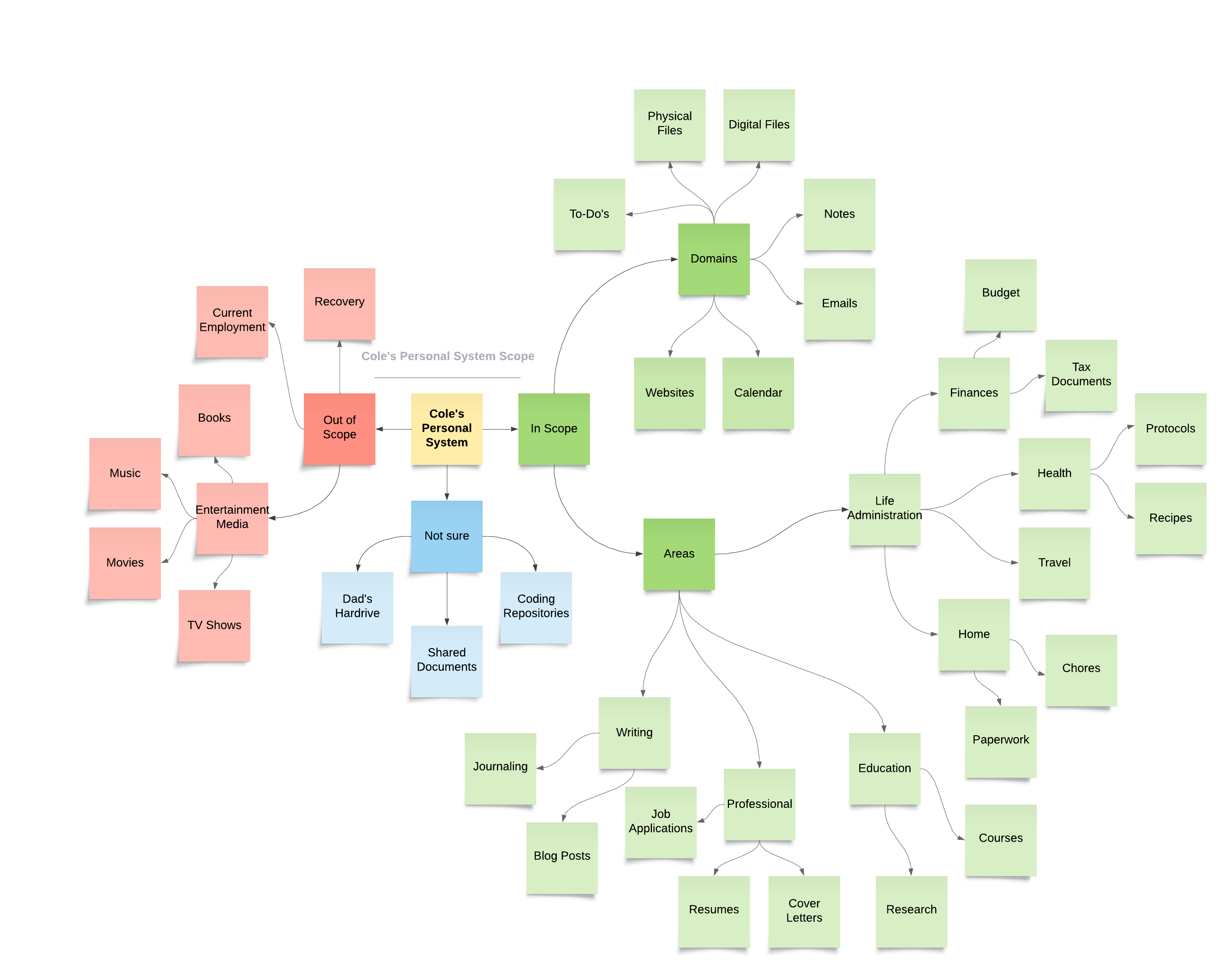 Admittedly, I too found it very hard not to start designing right away because as I identified areas of my life that are in scope, there were natural categories that emerged. While I could’ve listed the items within these areas of my life in a bullet point list, organizing it in the way that I did helped me recall certain things that I did want to include in my system. Hopefully, I didn’t go too far and think about the structure too much… Any feedback would be appreciated!