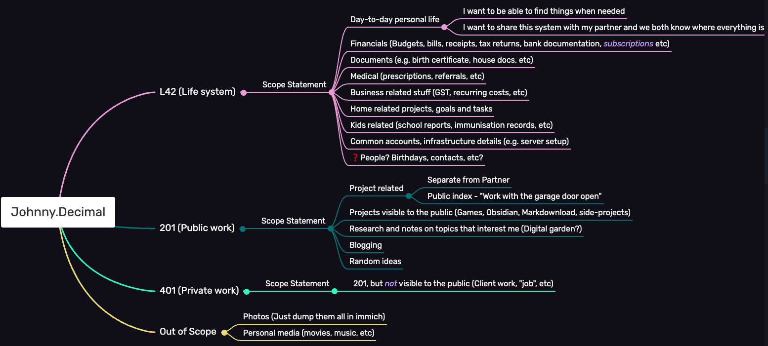 I’ve attempted to organise with Johnny.Decimal before (but it didn’t stick; I just don’t think I took it too seriously at first) and in those previous attempts I just kinda skipped the scope step entirely because my scope is just all the things.